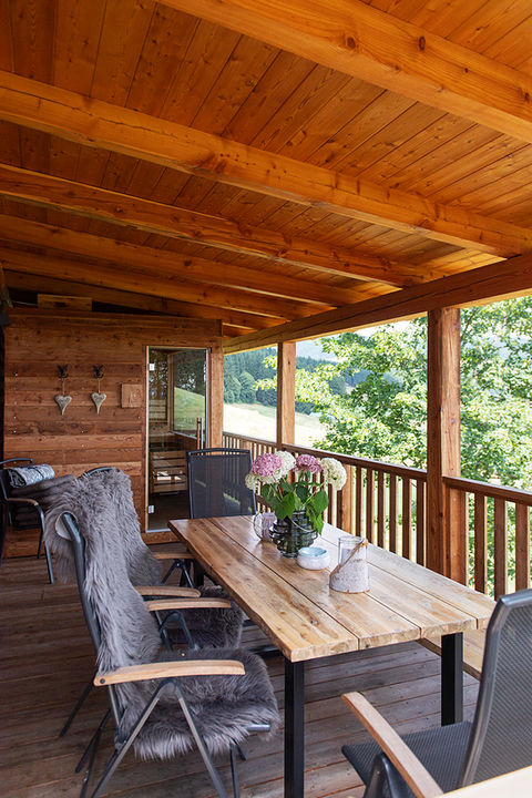In jedem Chalet gibt es ein großes Wohlfühlbadezimmer im OG mit Infrarotkabine und zwei separate Toiletten. Die Sauna mit Panoramafenster befindet sich auf der Terrasse.